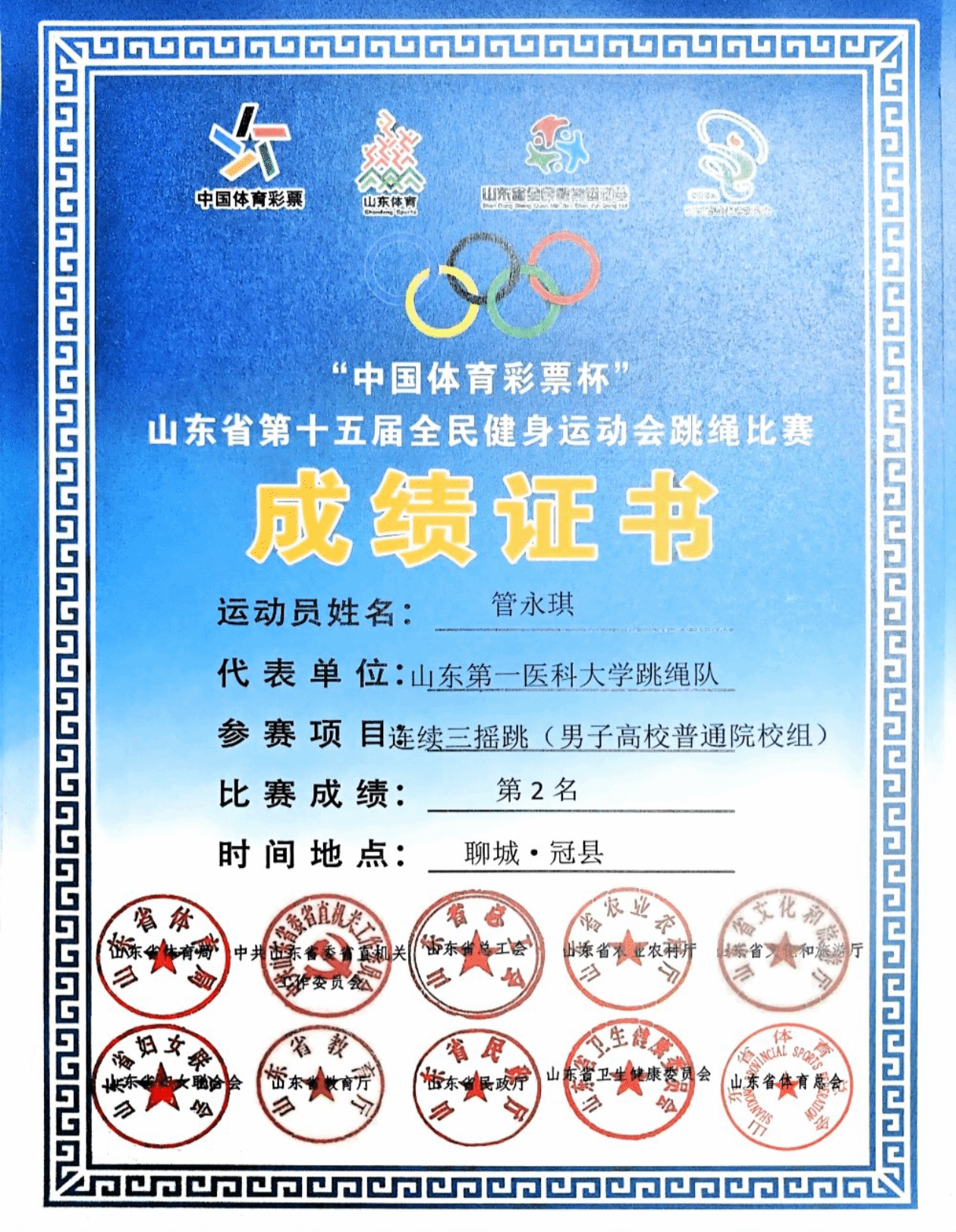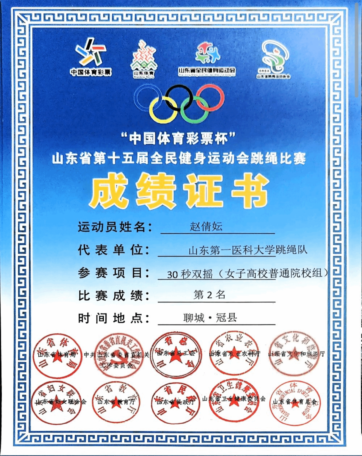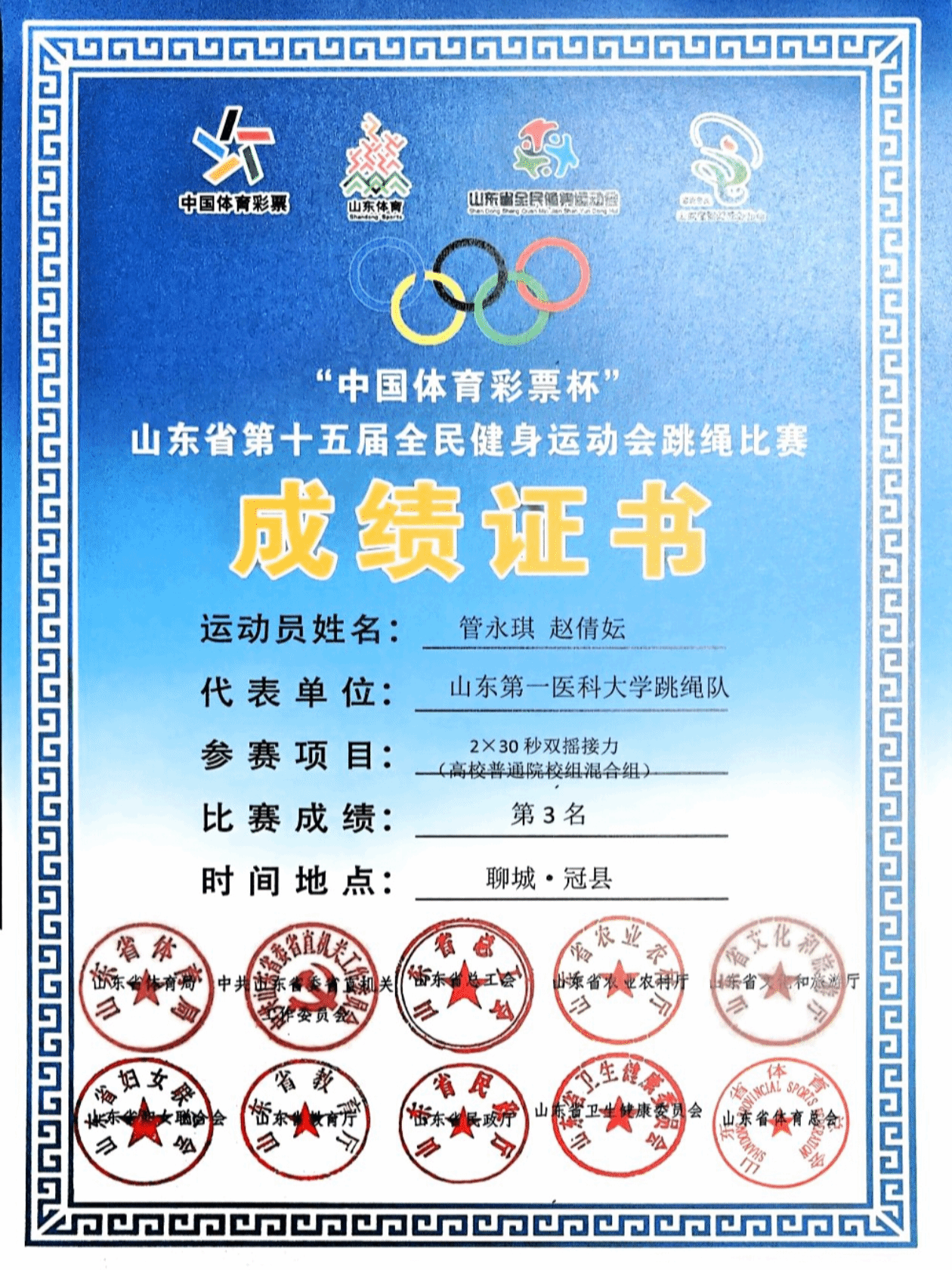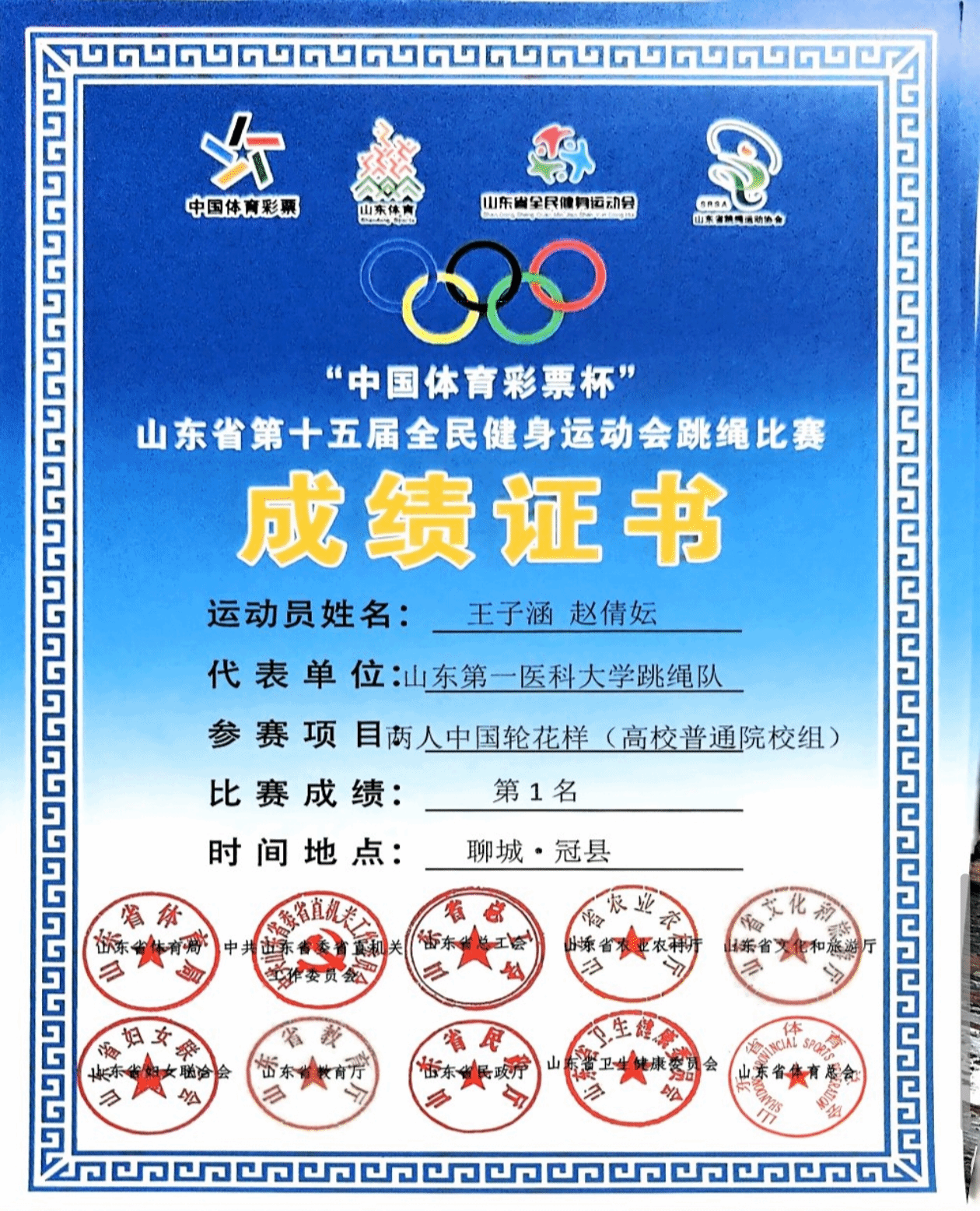 近日,山东省第十五届全民健身运动会跳绳赛圆满落幕,校(院)跳绳俱乐部斩获佳绩。其中护理学院赵倩妘、管永琪同学表现突出,一人揽多枚奖牌,为校(院)争光,尽显护理学子体育风采。