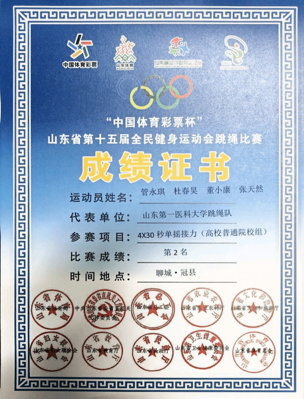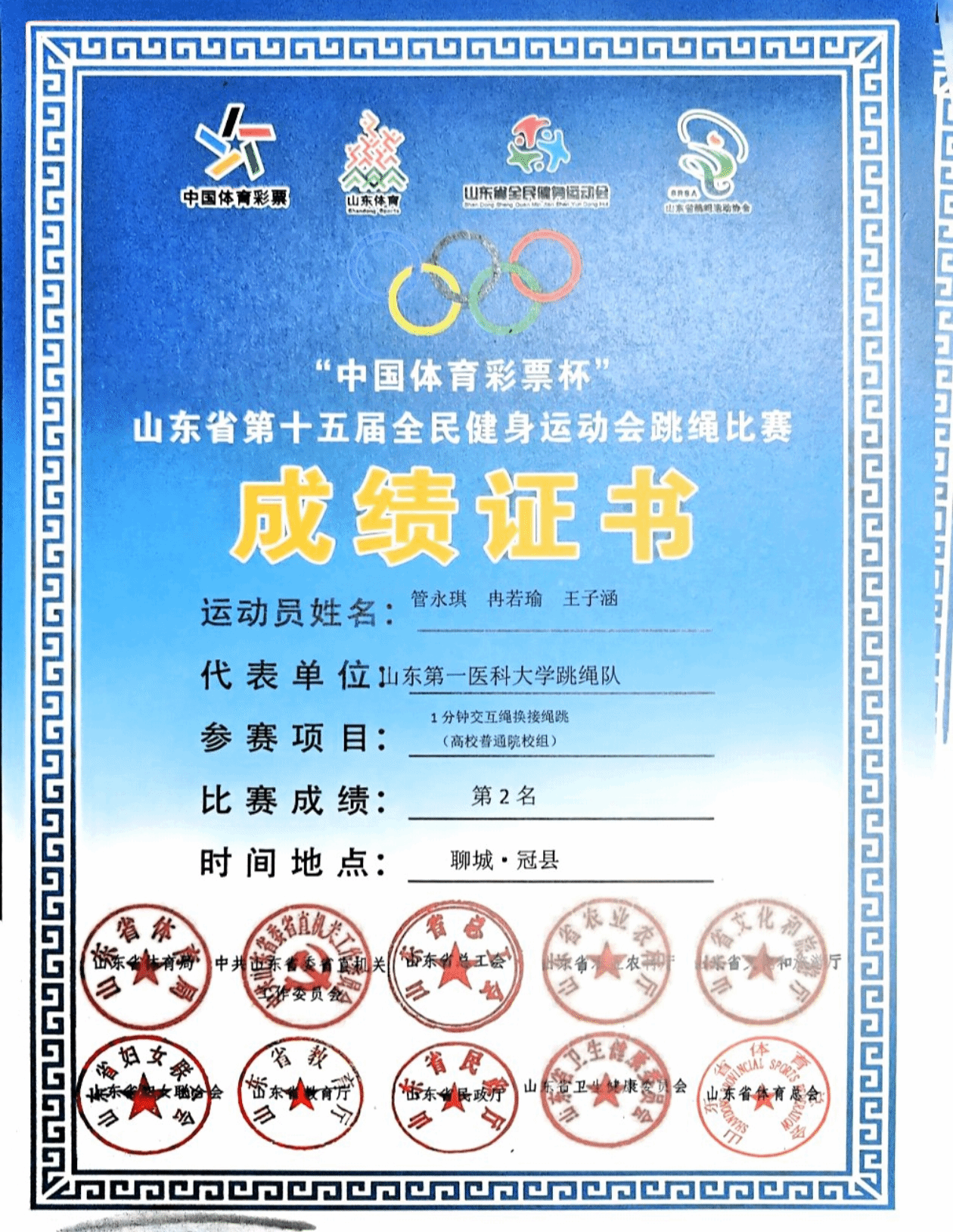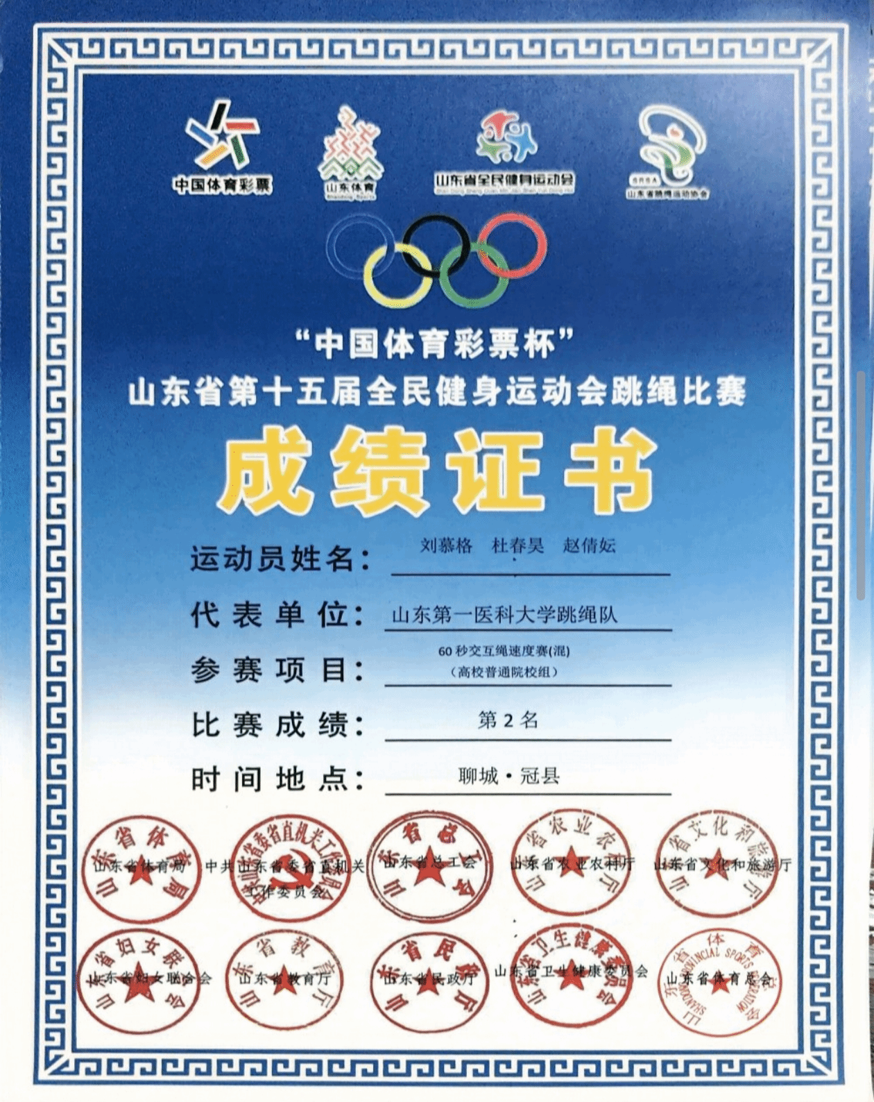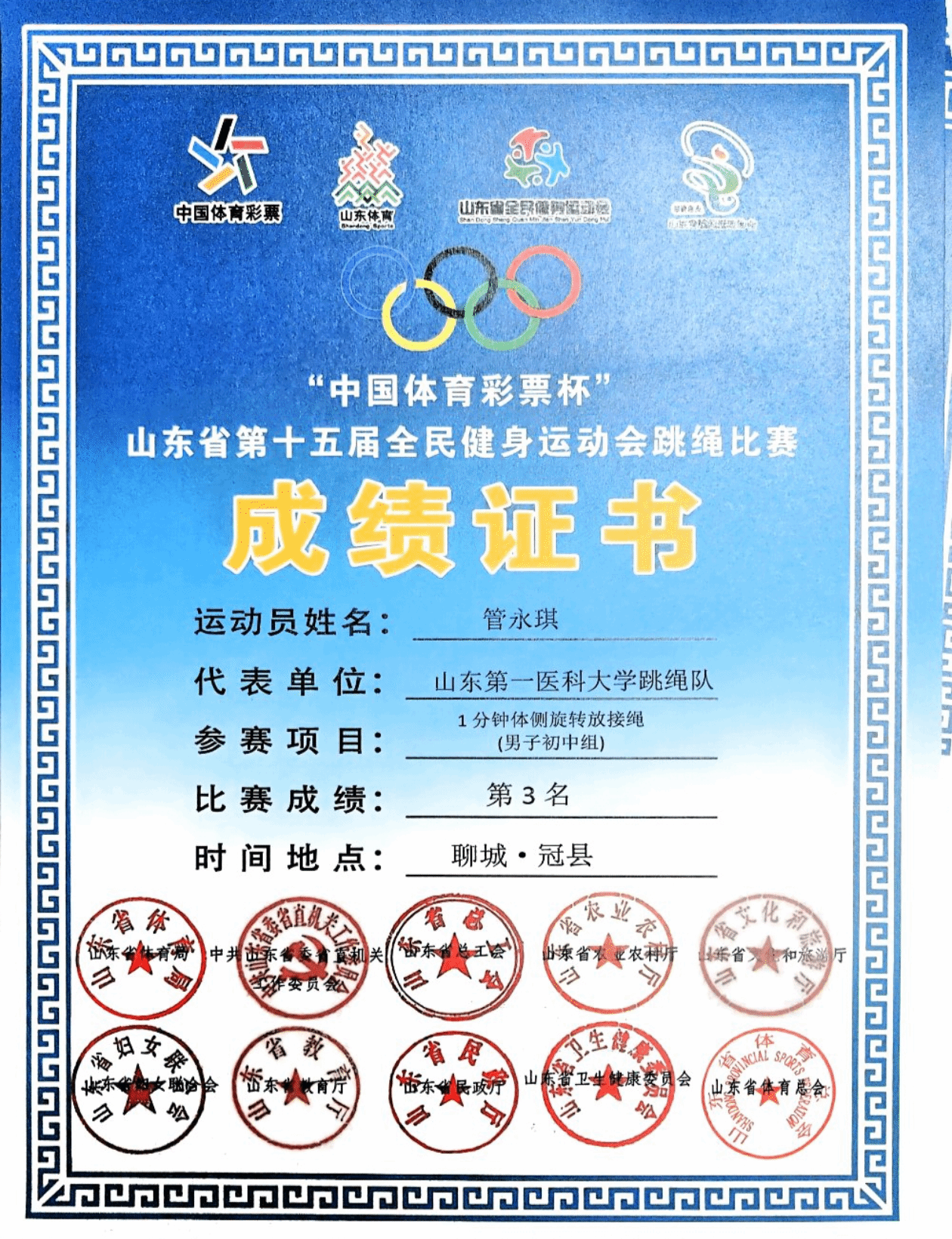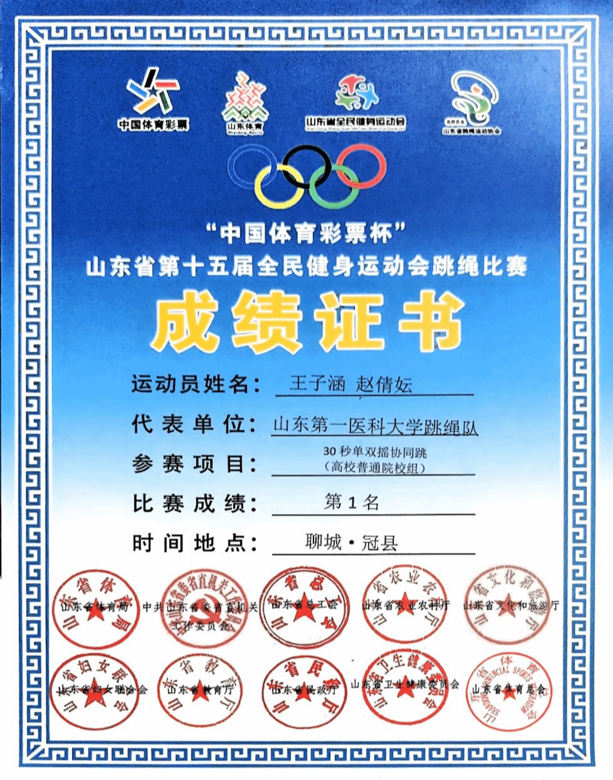 近日,山东省第十五届全民健身运动会跳绳赛圆满落幕,校(院)跳绳俱乐部斩获佳绩。其中护理学院赵倩妘、管永琪同学表现突出,一人揽多枚奖牌,为校(院)争光,尽显护理学子体育风采。