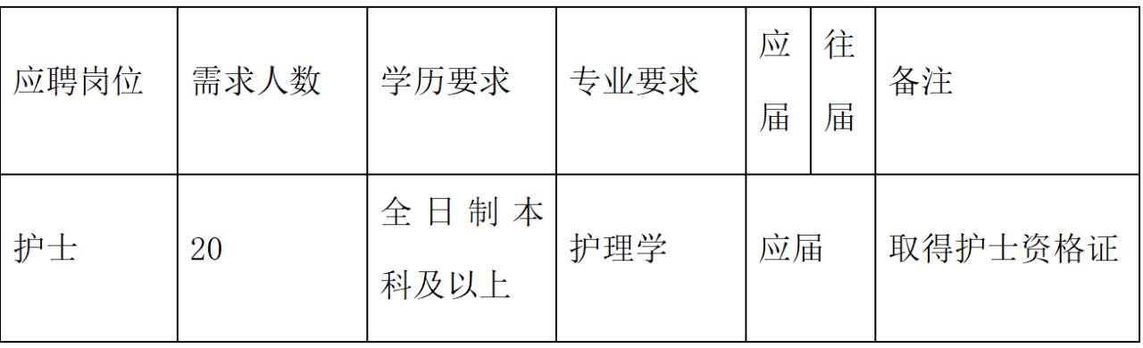 职业描述:1、本科及以上学历,护理专业,具有护士资格证 2、大专及以上学历,助产专业,具有护士资格证