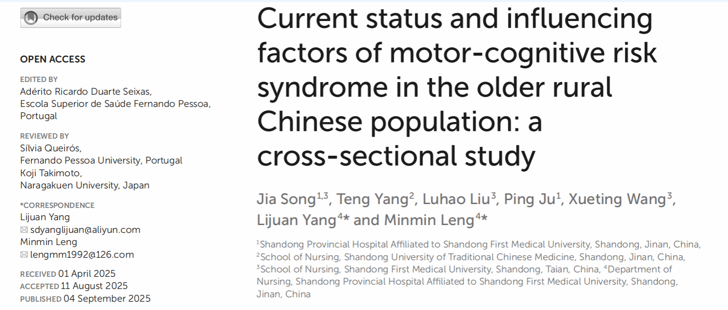 该文章由山东第一医科大学护理学院硕士研究生宋佳作为第一作者,研究生导师冷敏敏博士作为共同通讯作者,于2025年9月4日在Frontiers in Public Health(影响因子:3.4;JCR分区:Q1)期刊上发表。