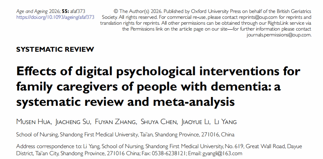 该文章由山东第一医科大学护理学院硕士研究生花木森作为第一作者,研究生导师杨黎教授作为通讯作者,于2026年1月在Age and Ageing(影响因子:7.1;中科院JCR分区:老年医学Q1)期刊上发表。